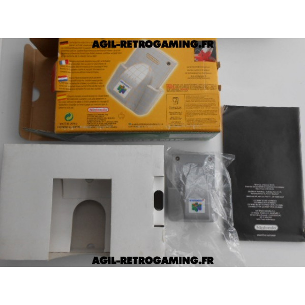 Kit Vibration Officiel pour Nintendo 64 complet et en excellent état : Boite avec support interne, notice et accessoire avec son cache-piles et sachet de protection d'origine.