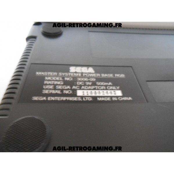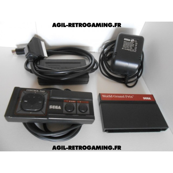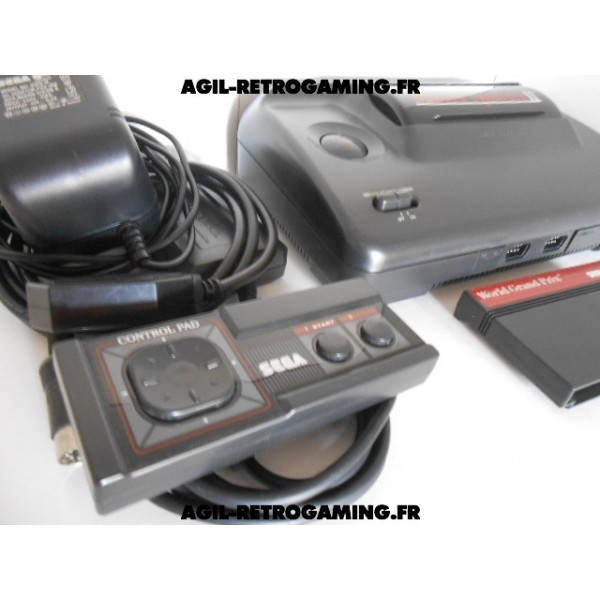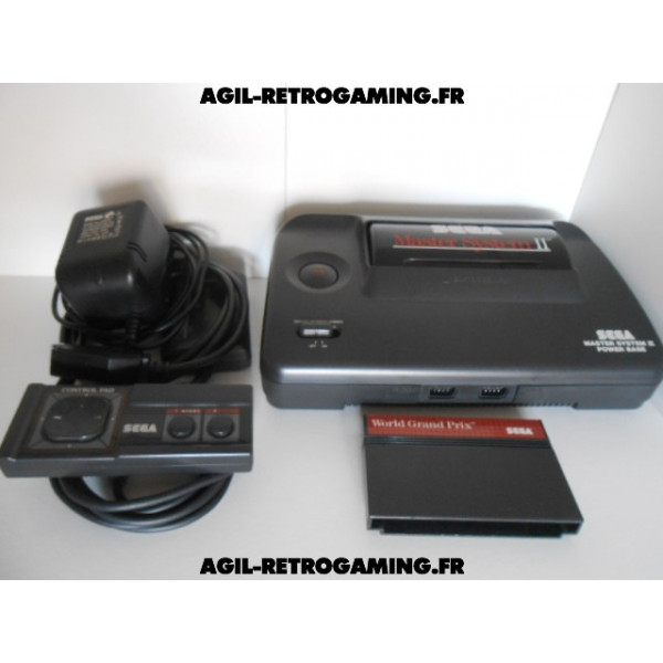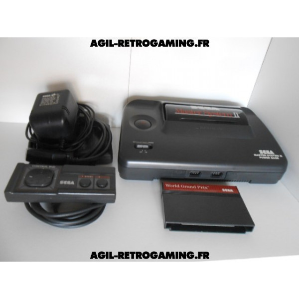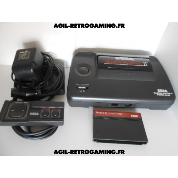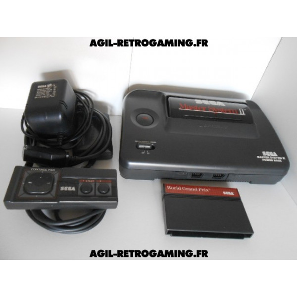 Console Sega Master System II (Power Base RGB) avec le jeu Alex Kidd intégré, livrée avec tous ses câbles et une manette officielle Sega + la cartouche du jeu World Grand Prix. Le tout est en très bon état et fonctionne parfaitement. Numéro de série : 110002662.