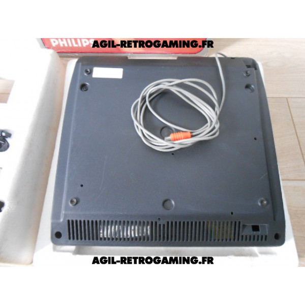 Console Philips : Videopac C52 avec sa boite d'origine (un peu abîmée et comportant plusieurs morceaux de scotch) et polystyrènes internes, console en très bon état avec son câble antenne, ses deux pads et son alimentation secteur.