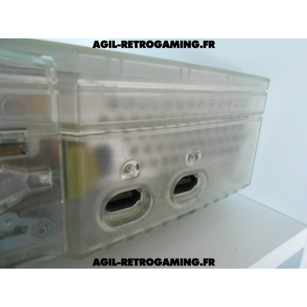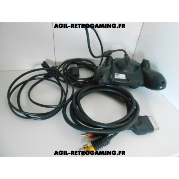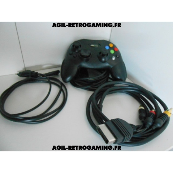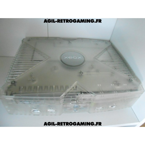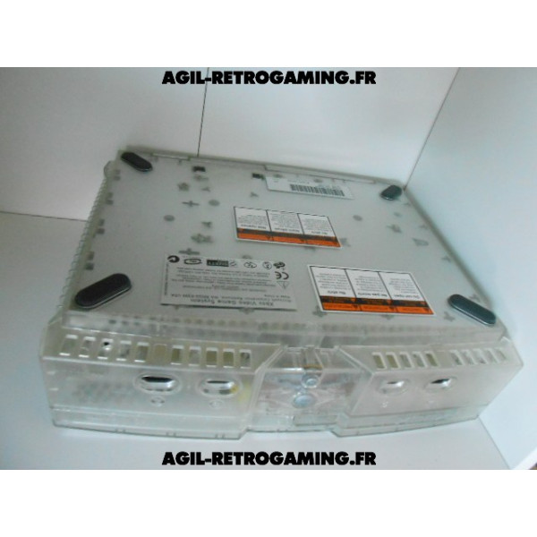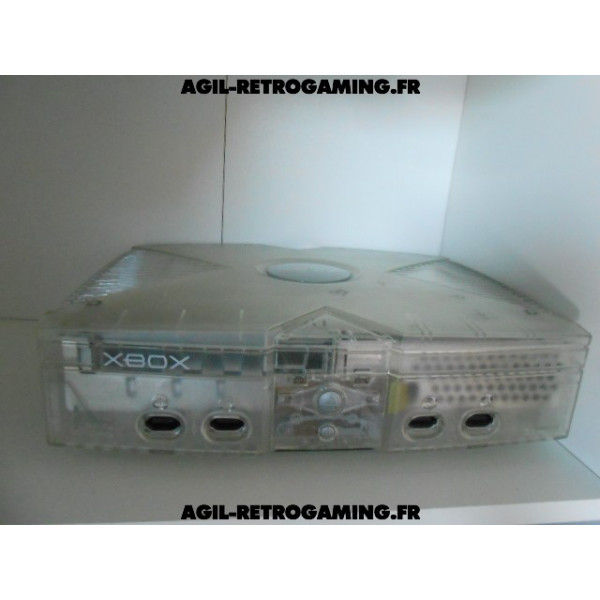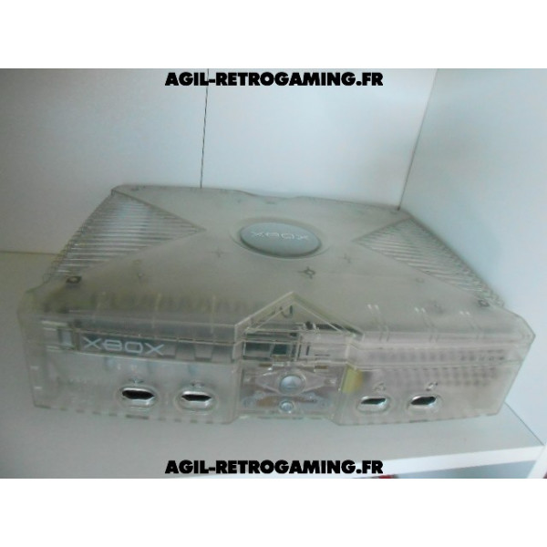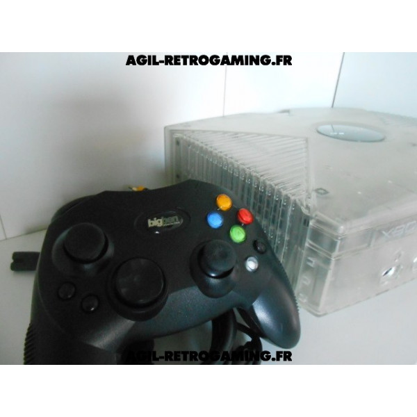 Console Xbox première génération translucide : Crystal d'occasion avec câbles et manette Big Ben noire.