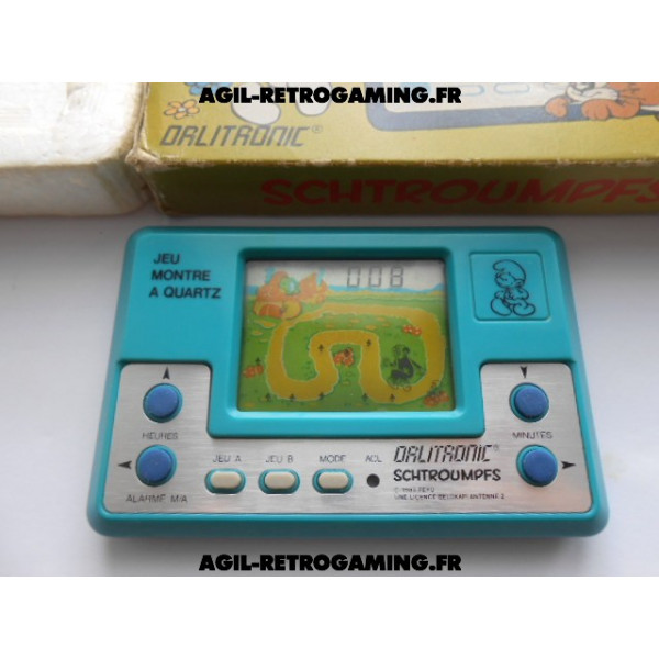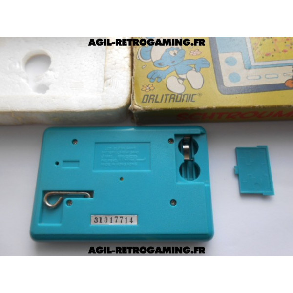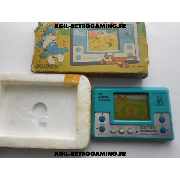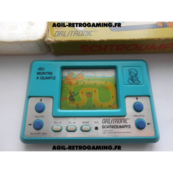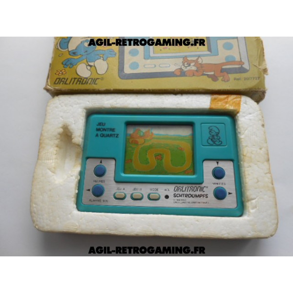 Jeu électronique Tiger type Game & Watch : Orlitronic - Les Schtroumpfs de 1982 en boite : Il manque les rabats à la boite (polystyrène présent), le jeu fonctionne parfaitement. Livré avec une pile LR44 neuve (béquille et cache-piles présents).