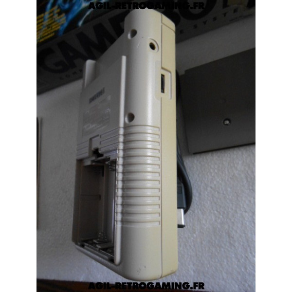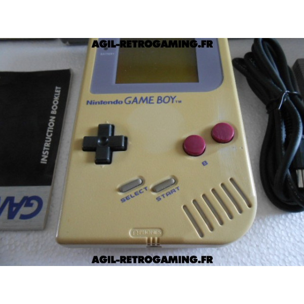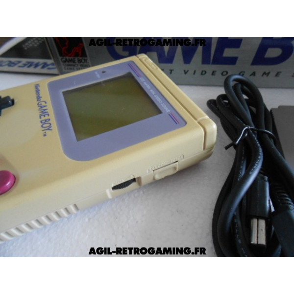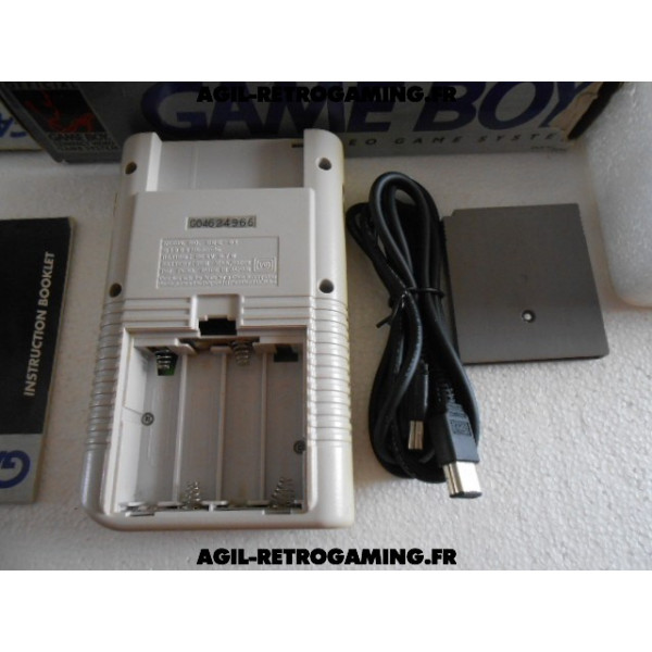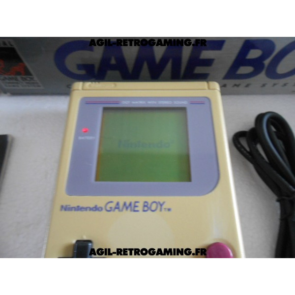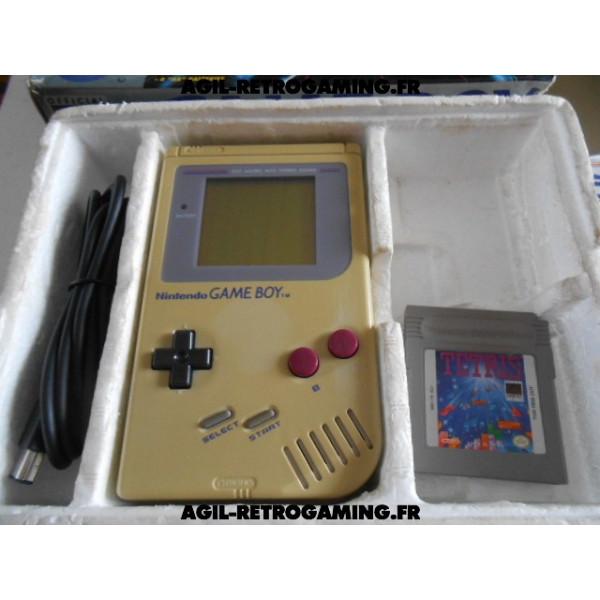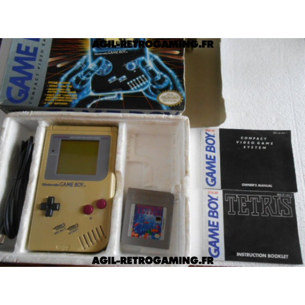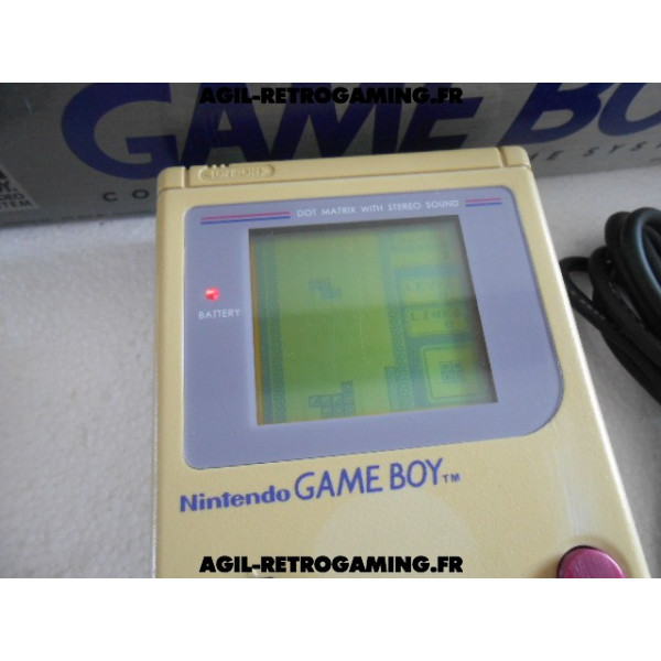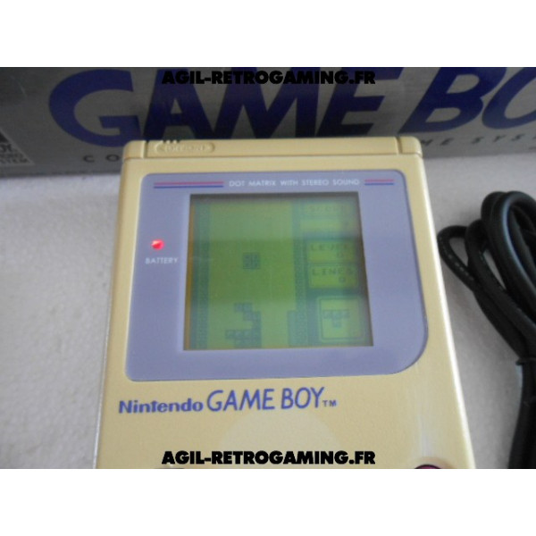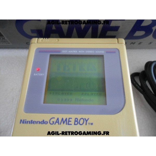 Console Game Boy Classique en boite : Pack Tetris sans les écouteurs mais avec le câble link officiel, le jeu Tetris avec son étui de protection, console jaunie sans cache-piles (vitre d'écran neuve sous film protecteur, fonctionne parfaitement) et les 2 notices, polystyrène interne présent. Il manque une languette à la boite, version USA.