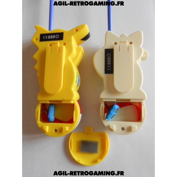 Talkie Walkies Pokémon à l'effigie de Pikachu et Miaouss, en bon état (il manque juste le cache-pile du talkie Miaouss) et fonctionne parfaitement. Nécessite 2 piles 9v (non-fournies).