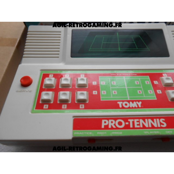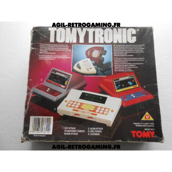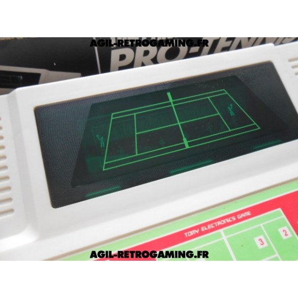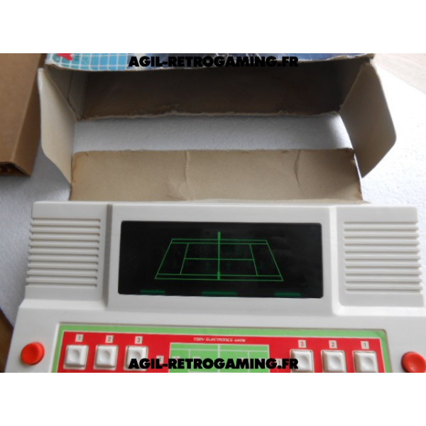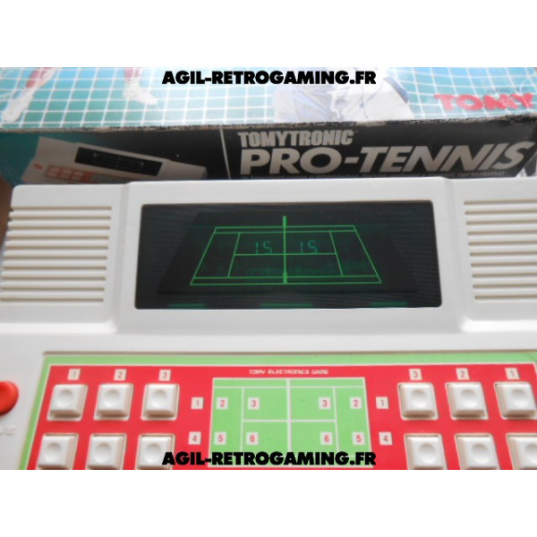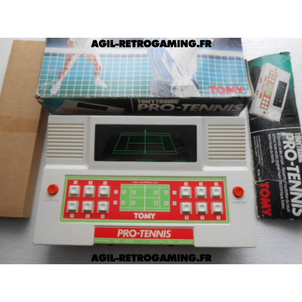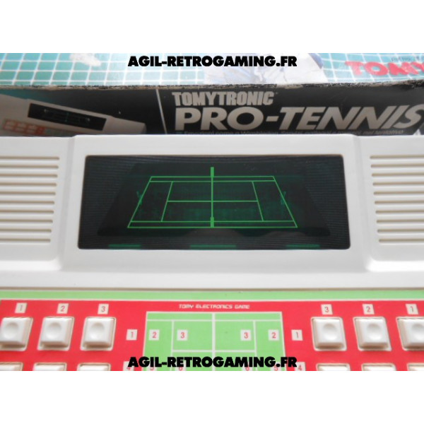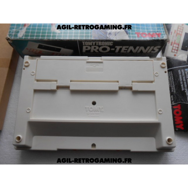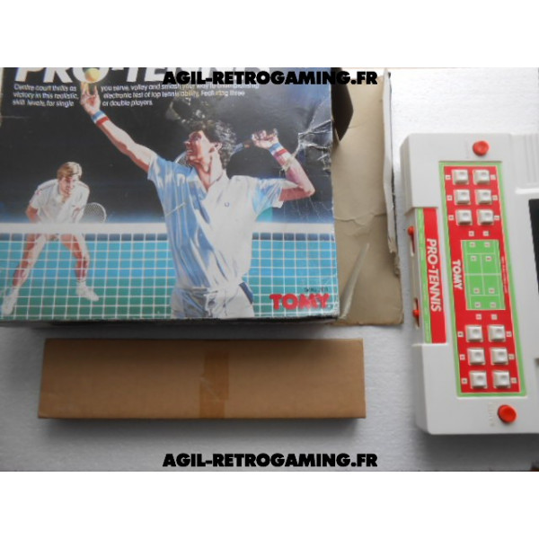 Jeu électronique : Tomytronic Pro-Tennis avec sa boite d'origine (un peu abimée et le rabat droit est arraché mais présent), le jeu est en très bon état avec son cache-piles et fonctionne parfaitement, les 4 piles modèle C (LR-14) sont fournies.
