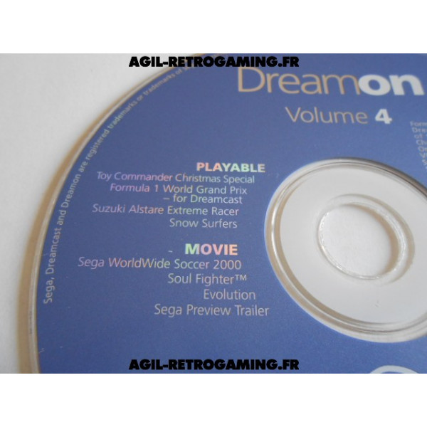 Disque DreamOn Volume 4 seul en bon état pour Sega Dreamcast, contenant les démos jouables de Toy Commander, Formula 1 World Grand Prix et Snow Surfers entres-autres.