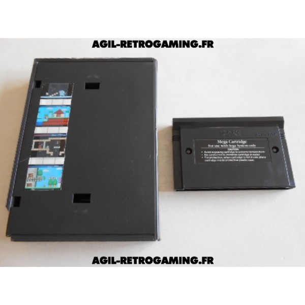 Cartouche de jeu en bon état avec son boitier (un peu abîmé) sur lequel ont été collés des morceaux de la jaquette originale, version européenne PAL pour Sega Master-System.