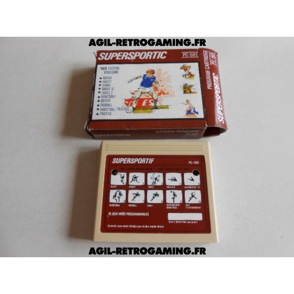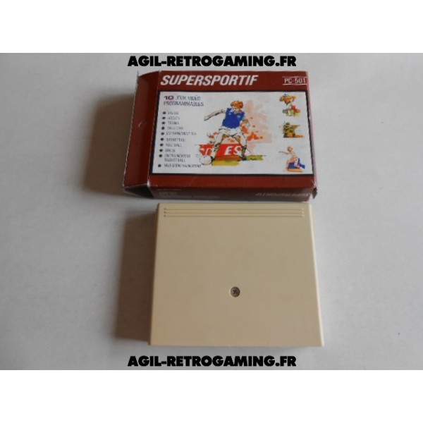 SuperSportic - SuperSportif : Cartouche programmée contenant 10 jeux pour console vintage SportsMaster : Pelote (Squash), Hockey, Tennis, Tir à deux (Target II), Entrainement Tir (Target I), BasketBall, FootBall (Soccer), Grille (GridBall), Entrainement BasketBall et Mur d'entrainement (Practice).
