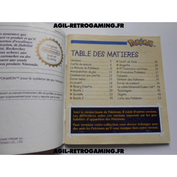 Manuel du jeu Pokémon Version Jaune sur Game Boy: convient également pour les versions bleue et rouge.