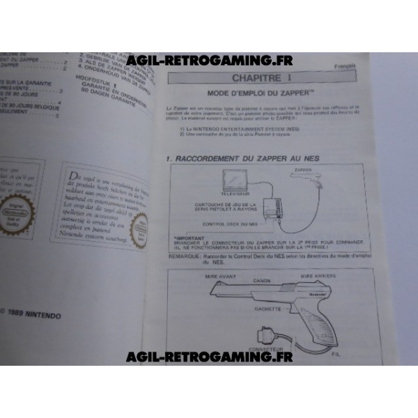 Notice du pistolet Zapper Nintendo : NES. Mode d'emploi en français et hollandais et en très bon état.