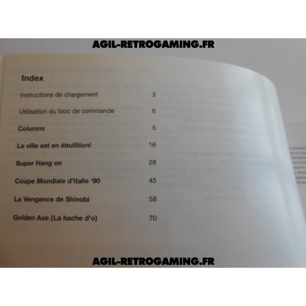 Mode d'emploi Mega-Games 6 - Cartouche de 6 jeux en 1 : The Revenge of Shinobi, Columns, Golden Axe, World Cup Italia '90, Super Hang-On, Streets Of Rage. Notice complète et en excellent état, intégralement en français.