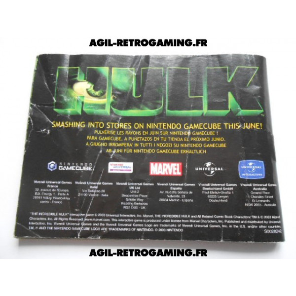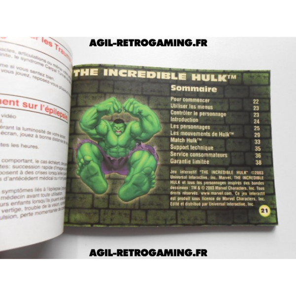 Notice du jeu The Incredible Hulk sur Game Boy Advance en bon état (dernière page un peu froissée, mode d'emploi de 100 pages en multi-langues dont le français).