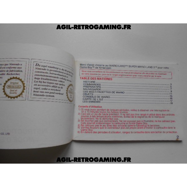 Notice du jeu Wario Land - Super Mario Land 3 sur Game Boy : Mode d'emploi complet et en très bon état (en français/hollandais).