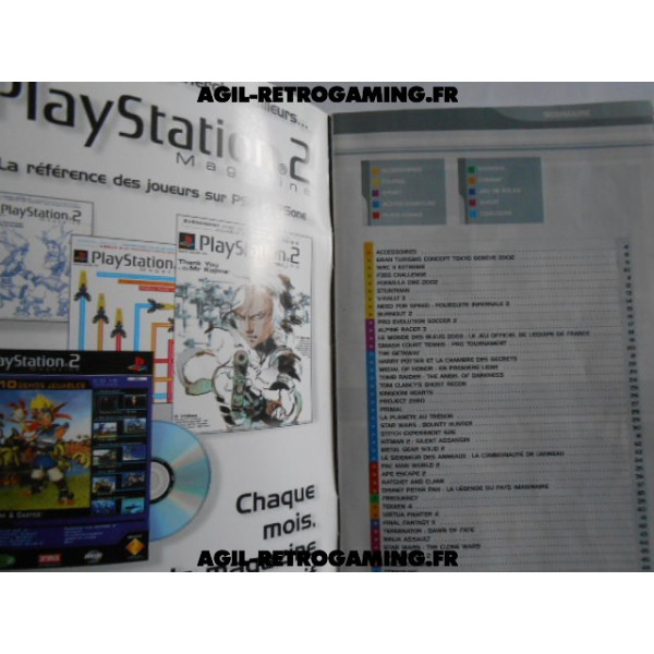 Catalogue des jeux PS2 2002/2003 : Divers accessoires et une quarantaine de jeux présentés parmi lesquels : Gran Turismo Concept Tokyo Genève 2002, V-Rally 3, Stuntman, Burnout 2, Alpine Racer 3, The Getaway, Tomb Raider The Angel of Darkness, Kingdom Hearts, Project Zero, Primal, Metal Gear Solid 2, Ape Escape 2, Ratchet and Clank, Tekken 4, Final Fantasy X, Ninja Assault...